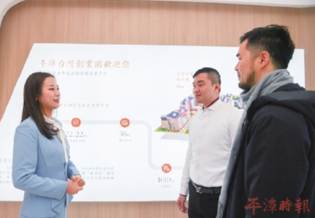 在臺創園4號樓一層的服務中心裏,工作人員正在給臺灣青年林珈鋒和鍾群光介紹臺創園園區配套設施。對於來平潭不到兩個月的林珈鋒來說,平潭的一切都是新的。